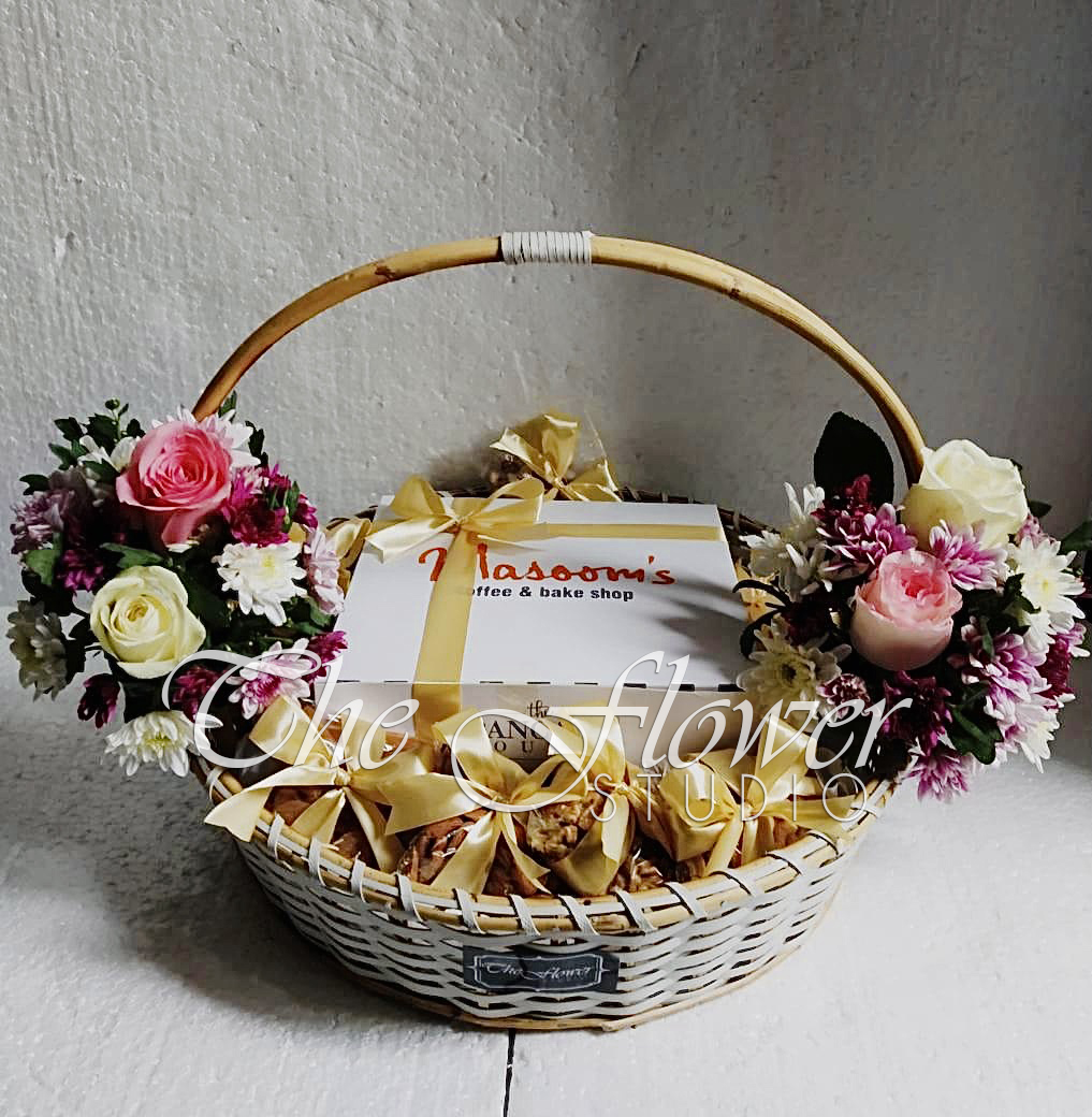 cake and dry fruit in a floral basket
