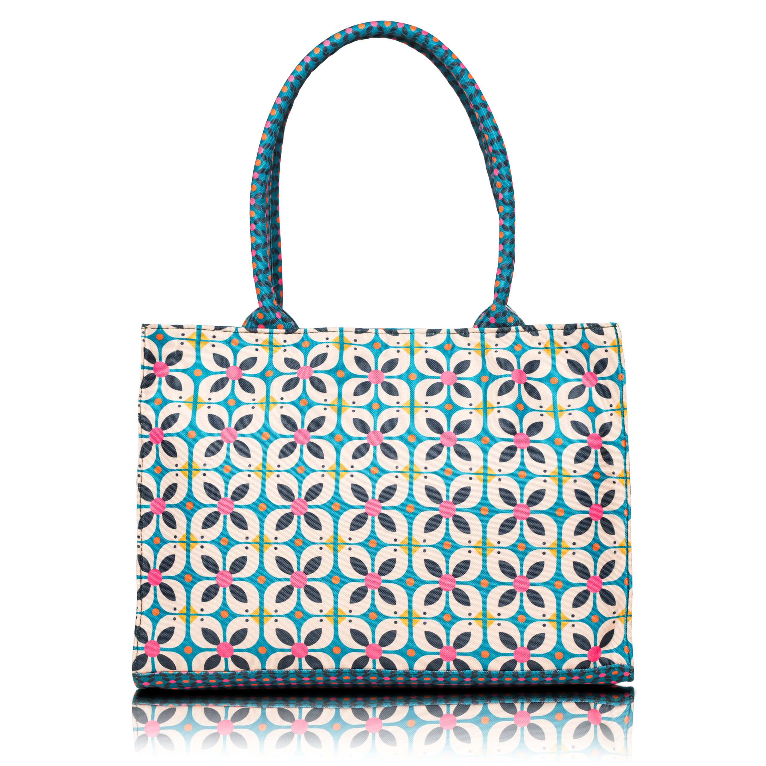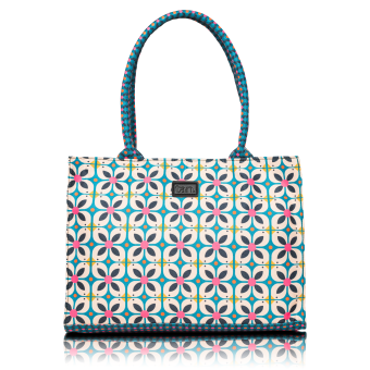 Bright, bold, and beautifully detailed — Aurea brings a playful touch to everyday style. Crafted from premium canvas with synthetic leather accents, it captures a blend of modern energy and casual sophistication. Its geometric floral pattern, in teal, pink, and ivory hues, makes it the perfect companion for both daily errands and workdays — effortlessly balancing color, charm, and practicality.
