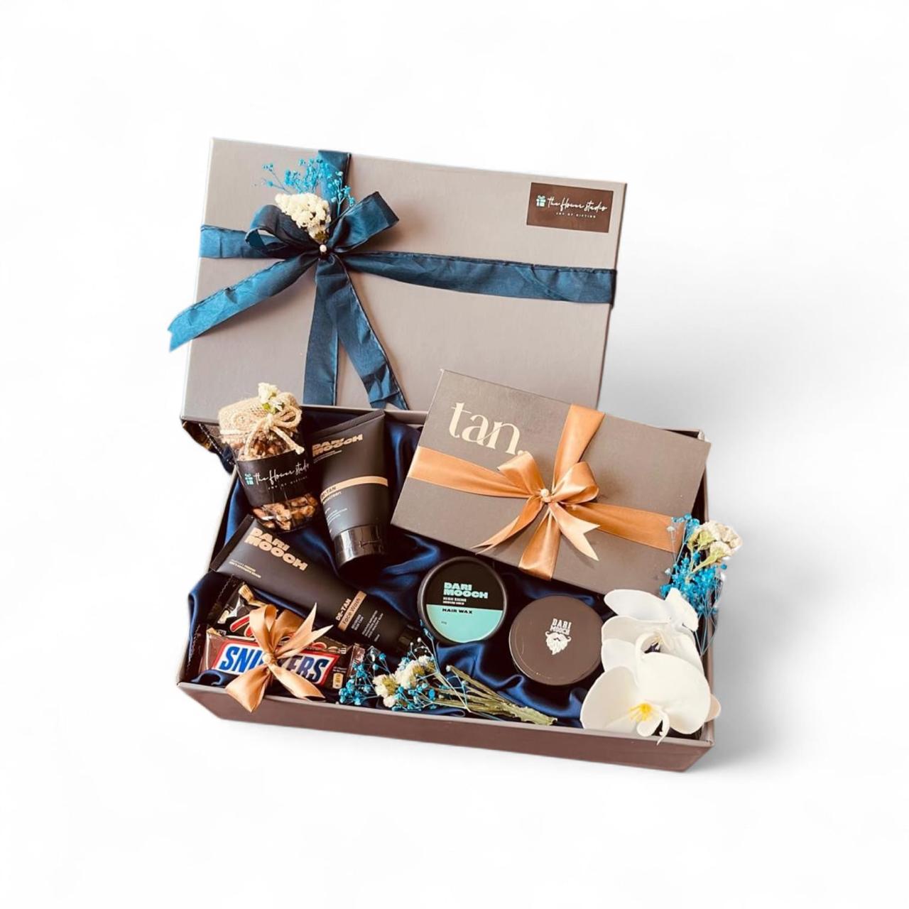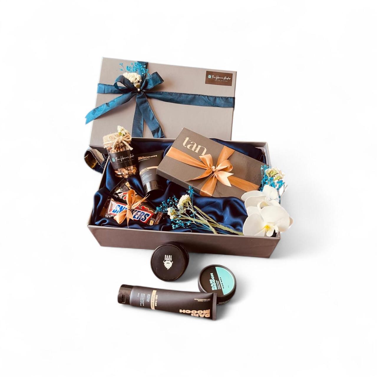 Featuring a gift box that includes a De-Tan sunscreen, a De-Tan facewash, a Hydro Gel moisturizer and hair wax by Dari Mooch, a set of 100% original men’s leather wallet and keychain giftbox by tan., a mars bar and a snickers bar beautifully decorated with faux flowers